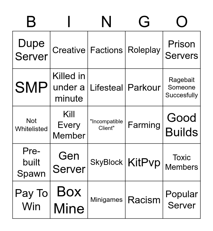 This bingo card has a free space and 24 words: Gen Server, Box Mine, Lifesteal, Pay To Win, Prison Servers, Dupe Server, SMP, Creative, Farming, SkyBlock, Parkour, Not Whitelisted, KitPvp, Toxic Members, Killed in under a minute, Racism, Good Builds, Factions, Ragebait Someone Succesfully, Kill Every Member, Popular Server, Pre-built Spawn, Roleplay and Minigames.