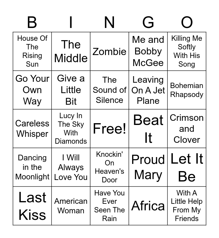 This bingo card has a free space and 34 words: I Will Survive, Africa, Ain't No Sunshine, Come Together, Dancing in the Moonlight, Give a Little Bit, Killing Me Softly With His Song, Last Kiss, The Middle, Rosanna, The Sound of Silence, Zombie, Smooth Criminal, Baby One More Time, Beat It, Bohemian Rhapsody, American Woman, Careless Whisper, I Will Always Love You, Proud Mary, Knockin' On Heaven's Door, Billie Jean, House Of The Rising Sun, Crimson and Clover, Have You Ever Seen The Rain, With A Little Help From My Friends, Me and Bobby McGee, Don't Fear The Reaper, Leaving On A Jet Plane, Go Your Own Way, I Get Around, Lucy In The Sky With Diamonds, Let It Be and Bad Reputation.