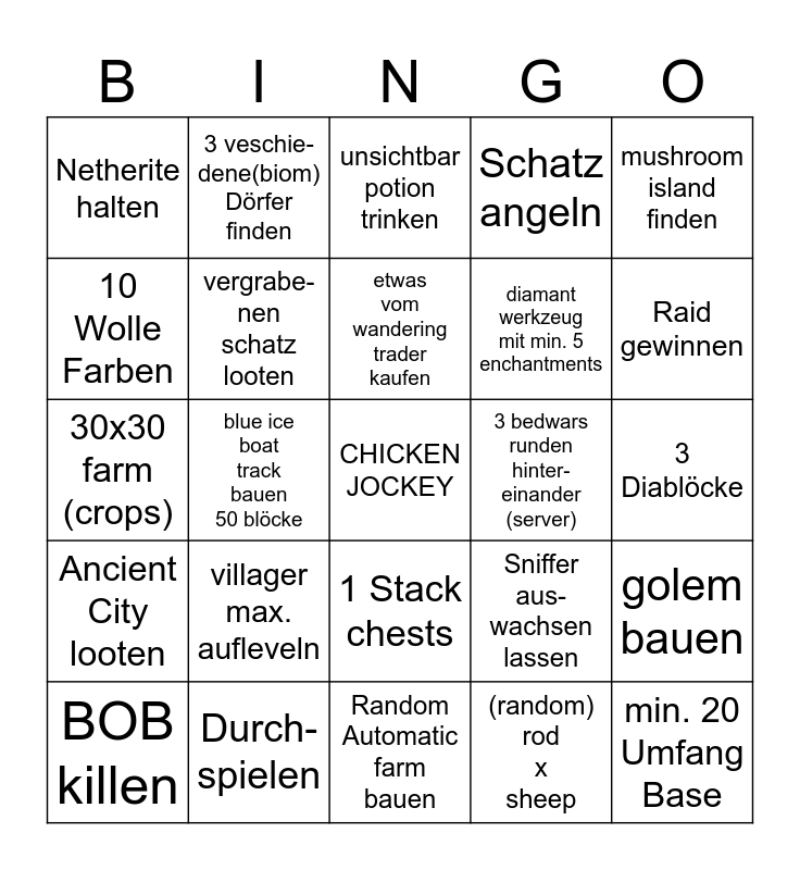 This bingo card has a free space and 24 words: villager max. aufleveln, Durch-spielen, etwas vom wandering trader kaufen, BOB killen, mushroom island finden, Netherite halten, 10 Wolle Farben, 3 veschie- dene(biom) Dörfer finden, 3 bedwars runden hinter-einander (server), 1 Stack chests, diamant werkzeug mit min. 5 enchantments, 30x30 farm (crops), Sniffer aus-wachsen lassen, golem bauen, vergrabe-nen schatz looten, (random) rod x sheep, 3 Diablöcke, unsichtbar potion trinken, Raid gewinnen, blue ice boat track bauen 50 blöcke, min. 20 Umfang Base, Ancient City looten, Schatz angeln and Random Automatic farm bauen.