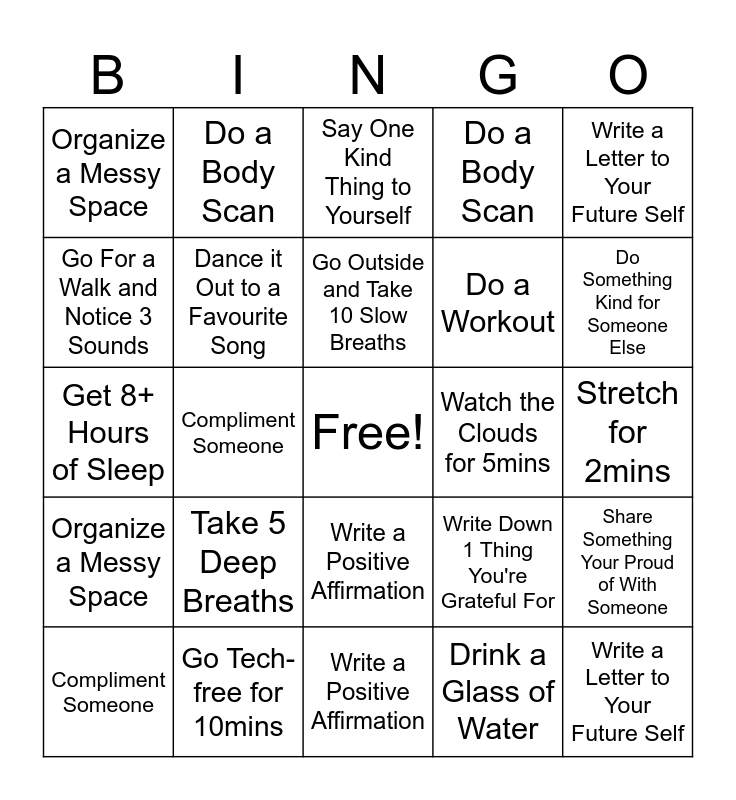 This bingo card has a free space and 24 words: Take 5 Deep Breaths, Go Tech-free for 10mins, Go Outside and Take 10 Slow Breaths, Compliment Someone, Write a Letter to Your Future Self, Organize a Messy Space, Go For a Walk and Notice 3 Sounds, Do a Body Scan, Watch the Clouds for 5mins, Write a Positive Affirmation, Do a Workout, Get 8+ Hours of Sleep, Write Down 1 Thing You're Grateful For, Share Something Your Proud of With Someone, Dance it Out to a Favourite Song, Drink a Glass of Water, Stretch for 2mins, Say One Kind Thing to Yourself, Do Something Kind for Someone Else, Compliment Someone, Write a Letter to Your Future Self, Organize a Messy Space, Do a Body Scan and Write a Positive Affirmation.