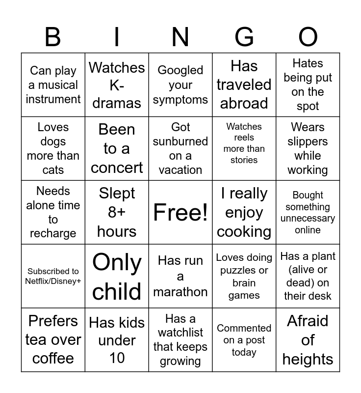 This bingo card has a free space and 24 words: Prefers tea over coffee, Only child, Got sunburned on a vacation, Commented on a post today, Hates being put on the spot, Can play a musical instrument, Watches K-dramas, Googled your symptoms, I really enjoy cooking, Bought something unnecessary online, Needs alone time to recharge, Been to a concert, Loves doing puzzles or brain games, Has a plant (alive or dead) on their desk, Loves dogs more than cats, Has kids under 10, Has a watchlist that keeps growing, Has traveled abroad, Wears slippers while working, Subscribed to Netflix/Disney+, Slept 8+ hours, Has run a marathon, Watches reels more than stories and Afraid of heights.