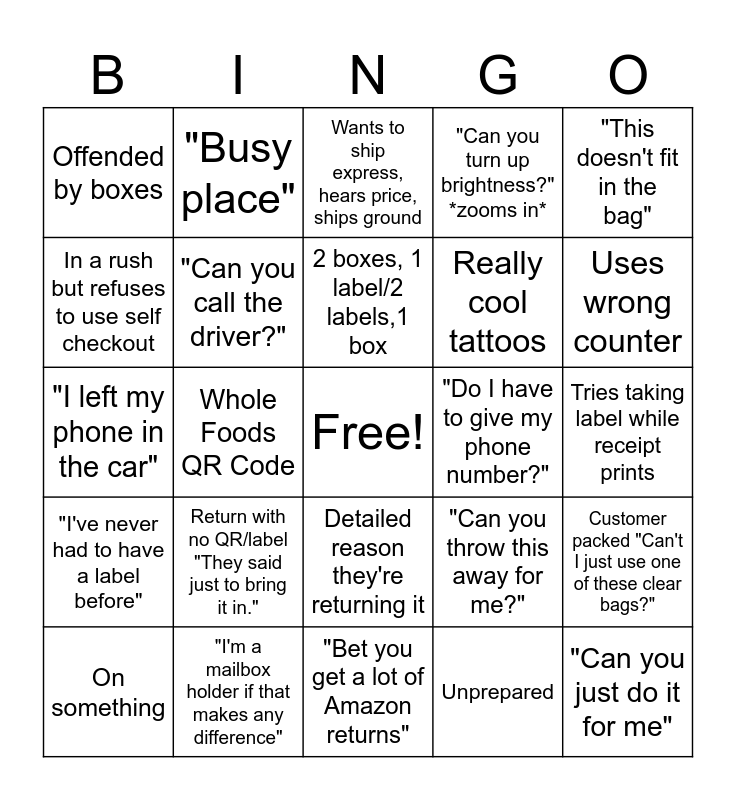 This bingo card has a free space and 54 words: "Is something on fire?", "I've never had to have a label before", Creepy old men, Will not set item down, Detailed reason they're returning it, Won't stop moving phone, "Can you turn up brightness?" *zooms in*, Old person with weird copying project, In a rush but refuses to use self checkout, "Shipping", Offended by boxes, "Who wants me?", "I'm a mailbox holder if that makes any difference", On something, Awkward conversations, "Bet you get a lot of Amazon returns", "Can you just do it for me", Really cool tattoos, How are you a functioning adult, Tries taking label while receipt prints, "Can you throw this away for me?", "It's cool in here, it's so hot outside", "Do I have to give my phone number?", "This doesn't fit in the bag", Printer jams, "Busy place", Email takes forever to go through, 10+ returns, FedEx, Unprepared, Takes forever to find codes, Thinks we're Amazon, "It's so quiet in here, it's always so busy!", Walks in, throws dropoff on ground, leaves, Wants to ship express, hears price, ships ground, Mad at DMV, "I left my phone in the car", Customer packed "Can't I just use one of these clear bags?", Finishes processing package, sees price, leaves, "Can you call the driver?", "Hi, how are you?" "Amazon return", "Wait actually this label goes with this one", Thinks we're the post office, *Says something completely out of pocket*, Return with no QR/label "They said just to bring it in.", "I thought that was the receipt" after printing terms and conditions, "I've never done this before", Starts nice, gets mean/Starts mean, gets nice, 2 boxes, 1 label/2 labels,1 box, Whole Foods QR Code, Uses wrong counter, "Can you tape this?", Talking in circles and Sets item on what you're working on.