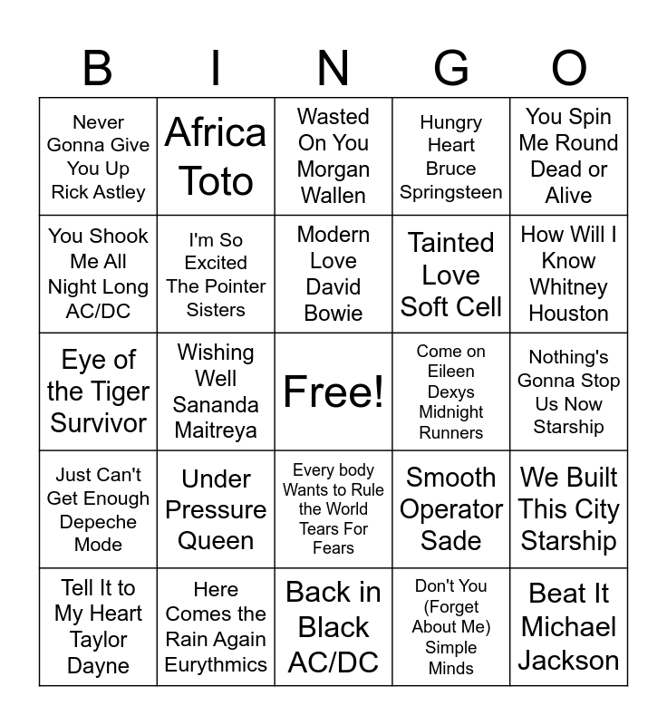 This bingo card has a free space and 76 words: Shotgun George Ezra, Praise Brandon Lake, Wasted On You Morgan Wallen, Praise You Anywhere Brandon Lake, Marry Me Thomas Rhett, Kiss Prince, Walk Like an Egyptian The Bangles, I Wanna Dance with Somebody Whitney Houston, Dancing in the Dark Bruce Springsteen, Don't Stop Believin' Journey, Material Girl Madonna, Take on Me a-ha, Modern Love David Bowie, You Shook Me All Night Long AC/DC, Down Under Men at Work, Wishing Well Sananda Maitreya, Girls Just Want to Have Fun Cyndi Lauper, Beat It Michael Jackson, Danger Zone Kenny Loggins, You Spin Me Round Dead or Alive, Uptown Girl Billy Joel, Eye of the Tiger Survivor, I'm So Excited The Pointer Sisters, Africa Toto, Hungry Heart Bruce Springsteen, Bed Are Burning Midnight Oil, You Can Call Me Al Paul Simon, Wake Me Up Before You Go-Go Wham!, The Power of Love Huey Lewis & The News, Footloose Kenny Loggins, Let's Dance David Bowie, Manic Monday The Bangles, You Got It Roy Orbison, Smooth Operator Sade, How Will I Know Whitney Houston, Tainted Love Soft Cell, Time After Time Cyndi Lauper, Maneater Hall & Oates, Nothing's Gonna Stop Us Now Starship, Don't You (Forget About Me) Simple Minds, Thriller Michael Jackson, All Night Long Lionel Richie, Total Eclipse of the Heart Bonnie Tyler, Jump Van Halen, Break My Stride Matthew Wilder, Every Breath You Take The Police, Tell It to My Heart Taylor Dayne, Never Gonna Give You Up Rick Astley, Red Red Wine UB40, Rosanna TOTO, Free Fallin' Tom Petty, Every body Wants to Rule the World Tears For Fears, On the Road Again Willie Nelson, True Colors Cyndi Lauper, (I've Had) The Time of My Life Bill Medley, Karma Chameleon Culture Club, Walking on Sunshine Katrine & The Waves, Walk This Way Run-D.M.C., She Drives Me Crazy Fine Young Cannibals, We Didn't Start the Fire Billy Joel, Under Pressure Queen, In the Air Tonight Phil Collins, Let's Groove Earth, Wind & Fire, Conga! Miami Sound Machine, Careless Whisper George Michael, Your Love The Outfield, Come on Eileen Dexys Midnight Runners, Video Killed the Radio Star The Buggles, Ghostbusters Ray Parker Jr., Our House Madness, We Built This City Starship, Just Can't Get Enough Depeche Mode, Here Comes the Rain Again Eurythmics, Holding Out for a Hero Bonnie Tyler, Back in Black AC/DC and Easy Lover Philip Bailey, Phil Collins.
