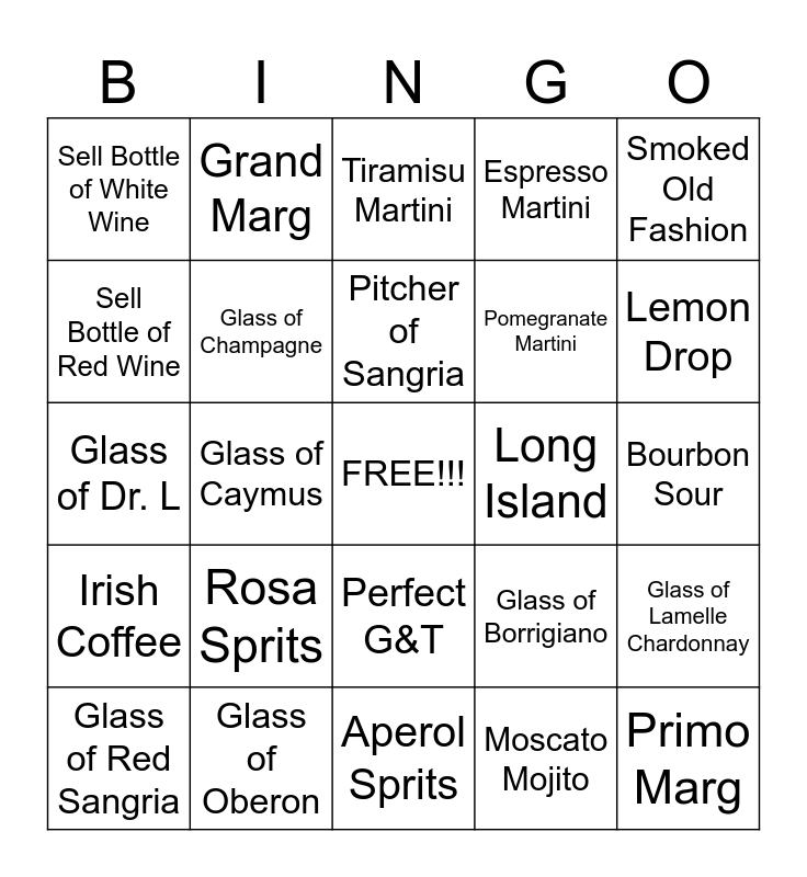 This bingo card has a free space and 24 words: Rosa Sprits, Glass of Oberon, Pitcher of Sangria, Glass of Red Sangria, Smoked Old Fashion, Sell Bottle of White Wine, Sell Bottle of Red Wine, Grand Marg, Long Island, Perfect G&T, Pomegranate Martini, Glass of Dr. L, Glass of Borrigiano, Glass of Lamelle Chardonnay, Glass of Champagne, Moscato Mojito, Bourbon Sour, Tiramisu Martini, Lemon Drop, Glass of Caymus, Primo Marg, Irish Coffee, Espresso Martini and Aperol Sprits.