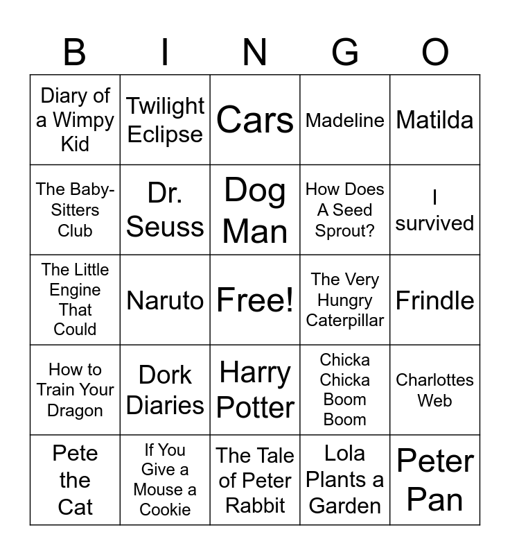 This bingo card has a free space and 24 words: Dork Diaries, If You Give a Mouse a Cookie, Dog Man, Pete the Cat, Matilda, Diary of a Wimpy Kid, The Baby-Sitters Club, Twilight Eclipse, The Very Hungry Caterpillar, Harry Potter, How Does A Seed Sprout?, The Little Engine That Could, Chicka Chicka Boom Boom, Charlottes Web, Dr. Seuss, Lola Plants a Garden, Frindle, Cars, I survived, Naruto, Peter Pan, How to Train Your Dragon, Madeline and The Tale of Peter Rabbit.