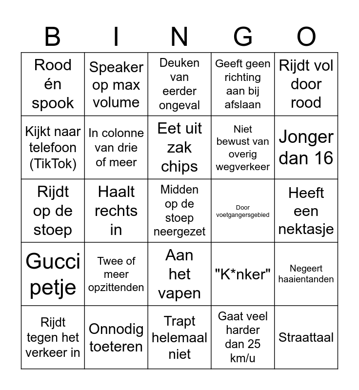 This bingo card has 25 words: Twee of meer opzittenden, Trapt helemaal niet, Eet uit zak chips, Rijdt tegen het verkeer in, Rijdt vol door rood, Rood én spook, Kijkt naar telefoon (TikTok), Speaker op max volume, Door voetgangersgebied, Aan het vapen, Niet bewust van overig wegverkeer, Rijdt op de stoep, "K*nker", Negeert haaientanden, In colonne van drie of meer, Straattaal, Heeft een nektasje, Deuken van eerder ongeval, Jonger dan 16, Haalt rechts in, Midden op de stoep neergezet, Onnodig toeteren, Gucci petje, Geeft geen richting aan bij afslaan and Gaat veel harder dan 25 km/u.