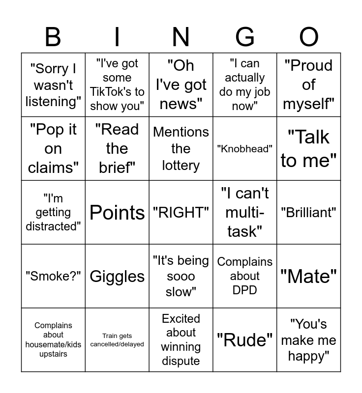 This bingo card has 35 words: "I forgot I was on chat", "I actually need to do some work", Smirks at queue size, "Read the brief", "It's being sooo slow", "I can actually do my job now", "Pop it on claims", Aggressive whispering, Mentions the lottery, Hating on frenchies, "I'm getting distracted", "Proud of myself", "Love", Randomly starts dancing, "Sorry I wasn't listening", "I can't multi-task", "Rude", Points, "Smoke?", "RIGHT", Complains about DPD, Complains about housemate/kids upstairs, "Mate", Train gets cancelled/delayed, "Oh I've got news", "Talk to me", "You's make me happy", Complains about social, "Knobhead", "Brilliant", "I need to do CCTV", Excited about winning dispute, Giggles, "I've got some TikTok's to show you" and "Oooooh".