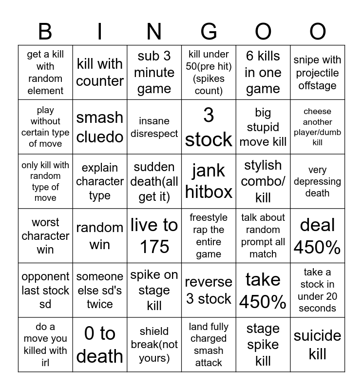This bingo card has 36 words: worst character win, random win, shield break(not yours), 3 stock, stylish combo/ kill, very depressing death, get a kill with random element, 0 to death, sub 3 minute game, reverse 3 stock, big stupid move kill, snipe with projectile offstage, opponent last stock sd, explain character type, insane disrespect, kill under 50(pre hit) (spikes count), take 450%, deal 450%, play without certain type of move, smash cluedo, live to 175, freestyle rap the entire game, talk about random prompt all match, take a stock in under 20 seconds, only kill with random type of move, kill with counter, sudden death(all get it), land fully charged smash attack, 6 kills in one game, cheese another player/dumb kill, do a move you killed with irl, someone else sd's twice, spike on stage kill, jank hitbox, stage spike kill and suicide kill.