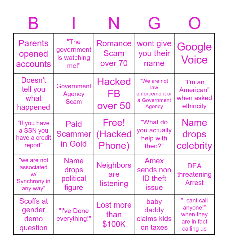 This bingo card has a free space and 24 words: Name drops political figure, "I've Done everything!", Hacked FB over 50, Scoffs at gender demo question, Google Voice, Parents opened accounts, Doesn't tell you what happened, "The government is watching me!", "What do you actually help with then?", Neighbors are listening, "We are not law enforcement or a Government Agency, "If you have a SSN you have a credit report", Amex sends non ID theft issue, DEA threatening Arrest, Government Agency Scam, baby daddy claims kids on taxes, Name drops celebrity, Romance Scam over 70, "I'm an American" when asked ethincity, Paid Scammer in Gold, "I cant call anyone!" when they are in fact calling us, "we are not associated w/ Synchrony in any way", wont give you their name and Lost more than $100K.