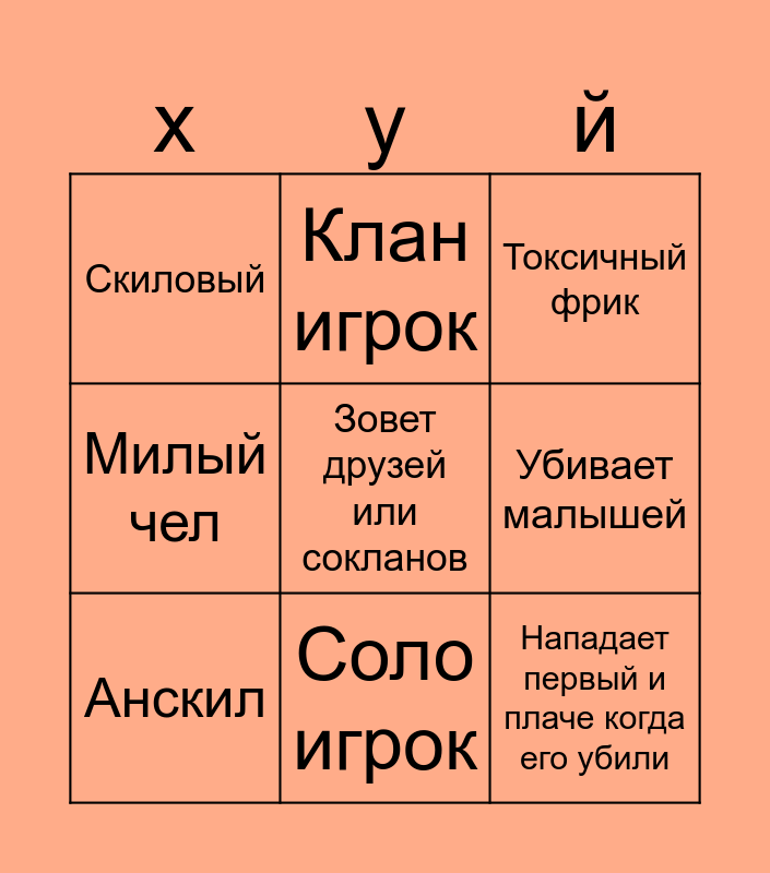 This bingo card has a free space and 8 words: Убивает малышей, Токсичный фрик, Клан игрок, Анскил, Скиловый, Нападает первый и плаче когда его убили, Милый чел and Соло игрок.