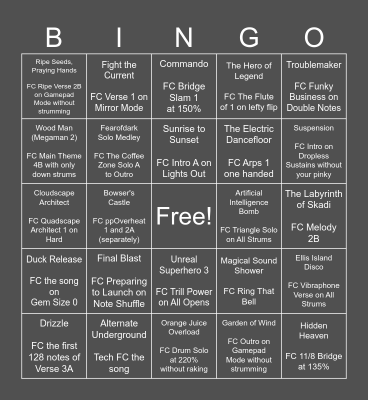This bingo card has a free space and 50 words: Handsome Guy FC Mini Solo and Solo, Hidden Heaven FC 11/8 Bridge at 135%, Danimal Across America FC Bridge on All Strums, Orange Juice Overload FC Drum Solo at 220% without raking, Final Blast FC Preparing to Launch on Note Shuffle, Lonely Rolling Star (Missing You) FC Bridge A at 135%, Fight the Current FC Verse 1 on Mirror Mode, BGM 2 FC Bridge on Dropless Sustains, Wood Man (Megaman 2) FC Main Theme 4B with only down strums, Time Paradox FC Time Spiral one handed at 65%, Fearofdark Solo Medley FC The Coffee Zone Solo A to Outro, The Hero of Legend FC The Flute of 1 on lefty flip, Ellis Island Disco FC Vibraphone Verse on All Strums, Magical Sound Shower FC Ring That Bell, Metal Squad FC Riff 1 at 150%, Burnie's Groove FC His Groove 1A with only down strums, Sunrise to Sunset FC Intro A on Lights Out, Artificial Intelligence Bomb FC Triangle Solo on All Strums, Lunar Highway FC Main Riff 1 on Precision Mode, Troublemaker FC Funky Business on Double Notes, Bowser's Castle FC ppOverheat 1 and 2A (separately), Garden of Wind FC Outro on Gamepad Mode without strumming, Ripe Seeds, Praying Hands FC Ripe Verse 2B on Gamepad Mode without strumming, The Electric Dancefloor FC Arps 1 one handed, Rising Tide FC Ebb and Flow 1 fretting with only 1 finger, underderderground FC SMB1 Intro on Gem Size 10, Suspension FC Intro on Dropless Sustains without your pinky, Acidjazzed Evening FC Alternating Synths 1 at 200%, Commando FC Bridge Slam 1 at 150%, Unreal Superhero 3 FC Trill Power on All Opens, 64 Forever FC Intro on Double Notes and Dropless Sustains, O Come, O Come, Emmanuel FC And Then God Said[...] on Rhythm Guitar, Rainbow Tylenol FC Bass Break 1 on Note Speed 3, Magic Fluter FC Solo 1 on Hard at 110%, Alternate Underground Tech FC the song, Rollerdisco Rumble FC Building Up at 175%, Dimension-Reversing Dualities FC Riff 4-5 on Mirror Mode, Opus I - We Were Younger FC Time Spiral on All Strums, Requiem For The Nineteen Fallen FC Attack of That Pattern on Mirror Mode, The Labyrinth of Skadi FC Melody 2B, A New World FC Rise A-E on All Strums at 110%, Alexander Brandon VGM Medley FC Go Down Refrain Melody on Precision Mode, Tim Follin Solo Medley FC Pictionary Solo A-C, Sayonara FC Intro A on All Strums, Drizzle FC the first 128 notes of Verse 3A, Cloudscape Architect FC Quadscape Architect 1 on Hard, Incident 01 FC Dramatic Outro without strumming or ghosting, Scorched Sands FC Hotfoot Riff 1 on Mirror Mode at 125%, Duck Release FC the song on Gem Size 0 and Perpetual Motion FC Interlude.