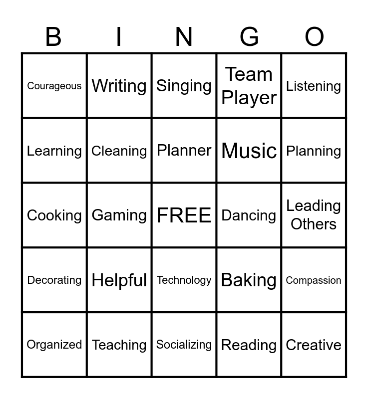 This bingo card has a free space and 24 words: Organized, Helpful, Planner, Reading, Listening, Courageous, Writing, Singing, Dancing, Leading Others, Cooking, Cleaning, Baking, Compassion, Learning, Teaching, Socializing, Team Player, Planning, Decorating, Gaming, Technology, Music and Creative.