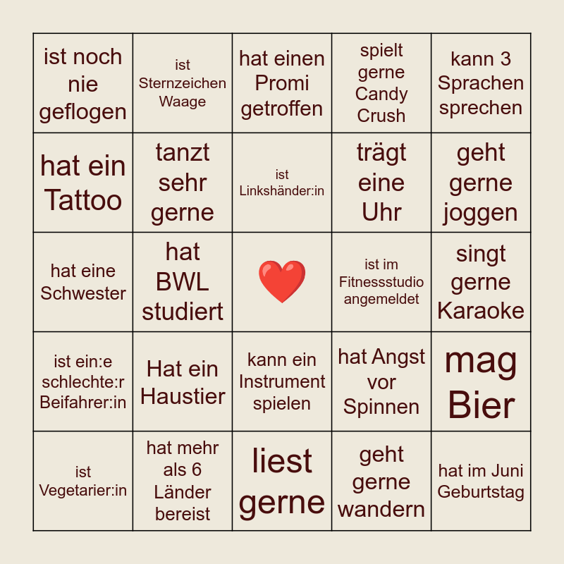 This bingo card has a free space and 24 words: Hat ein Haustier, hat mehr als 6 Länder bereist, ist Linkshänder:in, ist Vegetarier:in, kann 3 Sprachen sprechen, ist noch nie geflogen, hat ein Tattoo, ist Sternzeichen Waage, ist im Fitnessstudio angemeldet, kann ein Instrument spielen, trägt eine Uhr, hat eine Schwester, hat Angst vor Spinnen, mag Bier, tanzt sehr gerne, geht gerne wandern, singt gerne Karaoke, hat einen Promi getroffen, geht gerne joggen, hat BWL studiert, hat im Juni Geburtstag, ist ein:e schlechte:r Beifahrer:in, spielt gerne Candy Crush and liest gerne.