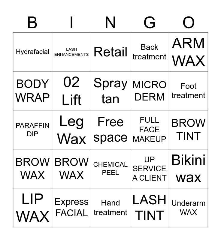 This bingo card has a free space and 24 words: BROW WAX, Express FACIAL, Spray tan, LIP WAX, ARM WAX, Hydrafacial, BODY WRAP, LASH ENHANCEMENTS, FULL FACE MAKEUP, CHEMICAL PEEL, MICRO DERM, PARAFFIN DIP, UP SERVICE A CLIENT, Bikini wax, 02 Lift, LASH TINT, BROW TINT, Retail, Foot treatment, Leg Wax, Underarm WAX, BROW WAX, Back treatment and Hand treatment.