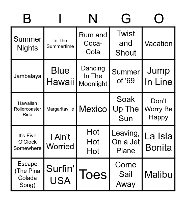 This bingo card has a free space and 49 words: All Summer Long, Coconut Woman, Come Fly With Me, Come Sail Away, Don't Worry Be Happy, Hot Fun In The Summertime, In The Summertime, Island In The Sun, Summer of '69, I've Been Everywhere, Jambalaya, Margaritaville, Leaving, On a Jet Plane, Malibu, No Shoes, No Shirt, No Problem, Permanent Vacation, Rum and Coca-Cola, Soak Up The Sun, Some Beach, Summer Nights, Surfin' USA, Toes, Twist and Shout, Vacation, Under the Boardwalk, I Ain't Worried, Dancing In The Moonlight, Fireball, La Isla Bonita, It's Five O'Clock Somewhere, Three Little Birds, Hot Hot Hot, I Was On A Boat That Day, One Margarita, Escape (The Pina Colada Song), Night Fever, Livin' La Vida Loca, La Bamba, Jump In Line, Kokomo, Hooked On A Feeling, The Boys Are Back In Town, Love Shack, Despacito, Hawaiian Rollercoaster Ride, Blue Hawaii, Let's Groove, Sweat and Is This Love.