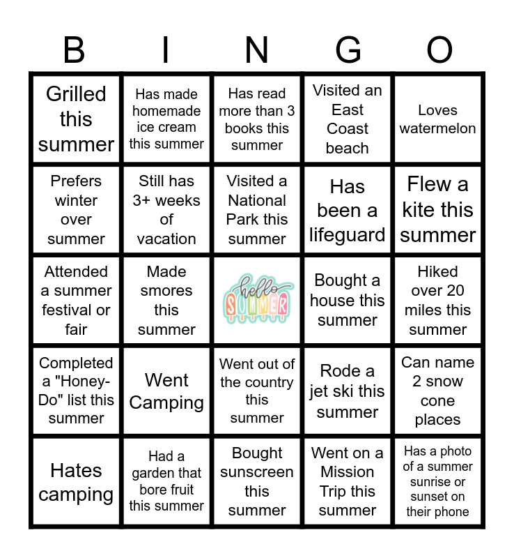 This bingo card has a free space and 34 words: Has a pool, Went on a Mission Trip this summer, Vacationed somewhere tropical this summer, Vacationed somewhere cold this summer, Completed a "Honey-Do" list this summer, Still has 3+ weeks of vacation, Loves watermelon, Hates camping, Has made homemade ice cream this summer, Doesn't like the beach, Visited a National Park this summer, Has read more than 3 books this summer, Got a tattoo this summer, Has a summer birthday, Bought a house this summer, Flew a kite this summer, Had a garden that bore fruit this summer, Attended a summer festival or fair, Went Camping, Rode a jet ski this summer, Went out of the country this summer, Had water balloon fight this summer, Grilled this summer, Hiked over 20 miles this summer, Bought sunscreen this summer, Has a photo of a summer sunrise or sunset on their phone, Visited an East Coast beach, Visited a West Coast beach, Has been a lifeguard, Prefers winter over summer, Can spell "Summertime" backwards, Made smores this summer, Can name 2 snow cone places and Been to more than 2 concerts this summer.