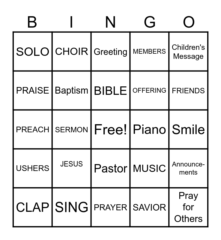 This bingo card has a free space and 24 words: JESUS, SING, BIBLE, CLAP, Children's Message, SOLO, PRAISE, CHOIR, Piano, Pastor, OFFERING, PREACH, MUSIC, Announce-ments, Baptism, SAVIOR, Smile, Greeting, FRIENDS, SERMON, Pray for Others, USHERS, MEMBERS and PRAYER.