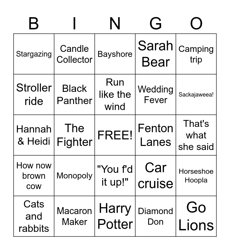 This bingo card has a free space and 66 words: hehe, Your mom!, Cornhole, Horseshoe Hoopla, Full service cabin, LA Dodgers, Candle Collector, Bejeweled, Run like the wind, Living Forward, "You f'd it up!", Are you ready for some football?, That's what she said, Camping trip, MeowMia, Stroller ride, The Fighter, Stargazing, Legos, Wedding Fever, Monopoly, How now brown cow, Sarah Bear, Queso blanco, Tubing trip, Culligan, The Big Banana, Turtle Tuesday, Go Lions, Choo mean?, Cats and rabbits, Tenacity, Stillwater, Sexy Cat Dad, Car cruise, Macaron Maker, Red velvet, Hannah & Heidi, Diamond Don, Go floss yourself, Black Panther, I Can't Believe It's Not Gutter!, Fenton Lanes, not hehe, The Gabinator, Mom the Mule Maker, Sackajaweea!, Kissing Kitchen, 69 heh heh heh, Renaissance Festival, Chapstick, Deez nuts!, Sam the Man, Colorado, Taco Tuesday, Pineapple apple pen, Human Claw, There's a pill for that, Bayshore, Harry Potter, Walk like the wind, Starbucks, Waterguy, Dancing Queen, Justified and Get Smart.