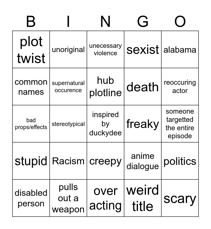 This bingo card has a free space and 24 words: Racism, pulls out a weapon, hub plotline, disabled person, alabama, plot twist, common names, unoriginal, freaky, creepy, death, bad props/effects, anime dialogue, politics, supernatural occurence, weird title, someone targetted the entire episode, unecessary violence, reoccuring actor, stereotypical, scary, stupid, sexist and over acting.
