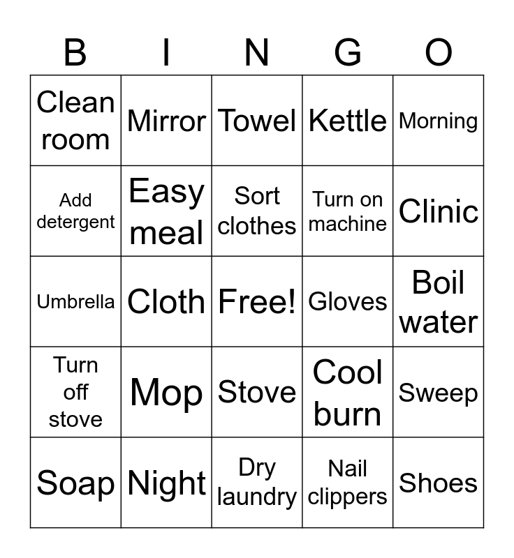 This bingo card has a free space and 43 words: Toothbrush, Shoes, Wash hands, Soap, Hairbrush, Nail clippers, Towel, Deodorant, Morning, Night, Kettle, Gloves, Stove, Mop, Shop, Dry laundry, Call for help, Umbrella, Alarm clock, Clinic, Mirror, Medication schedule, Pillbox, Clean room, Tidy, Boil water, Add teabag, Pour water, Cool burn, Turn off stove, Open windows, Sweep, Cleaning spray, Cloth, Toilet brush, Grooming, Routine chart, Sort clothes, Add detergent, Turn on machine, List, Easy meal and Phone reminder.