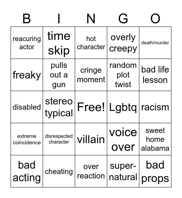 This bingo card has a free space and 24 words: bad acting, disrespected character, cringe moment, super- natural, death/murder, reacuring actor, time skip, hot character, Lgbtq, racism, disabled, pulls out a gun, voice over, sweet home alabama, freaky, cheating, over reaction, overly creepy, bad life lesson, extreme coincidence, stereo typical, villain, random plot twist and bad props.