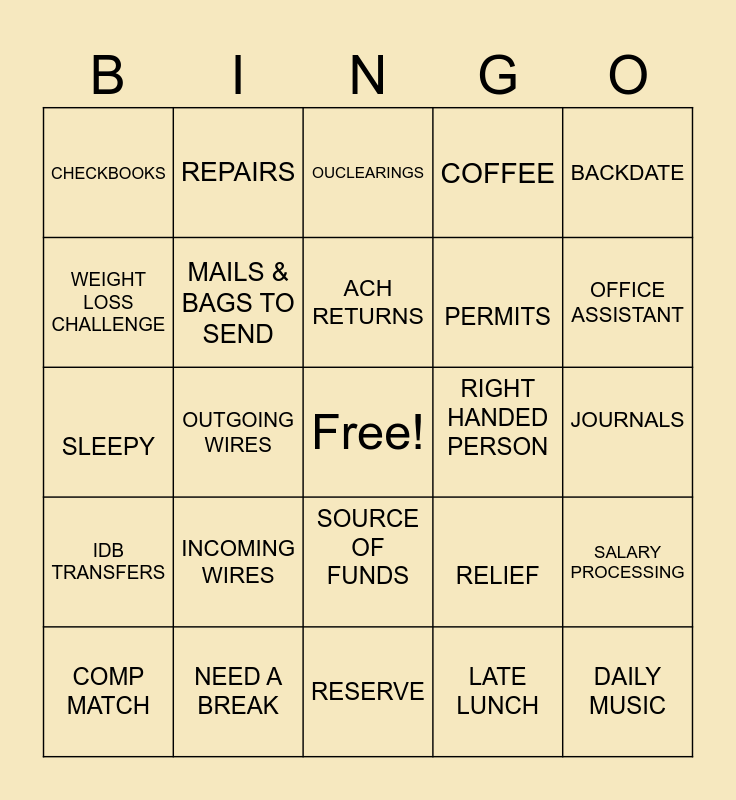 This bingo card has a free space and 24 words: INCOMING WIRES, NEED A BREAK, ACH RETURNS, COMP MATCH, BACKDATE, CHECKBOOKS, WEIGHT LOSS CHALLENGE, REPAIRS, RIGHT HANDED PERSON, SOURCE OF FUNDS, PERMITS, SLEEPY, RELIEF, SALARY PROCESSING, MAILS & BAGS TO SEND, LATE LUNCH, JOURNALS, OUCLEARINGS, OFFICE ASSISTANT, OUTGOING WIRES, DAILY MUSIC, IDB TRANSFERS, COFFEE and RESERVE.