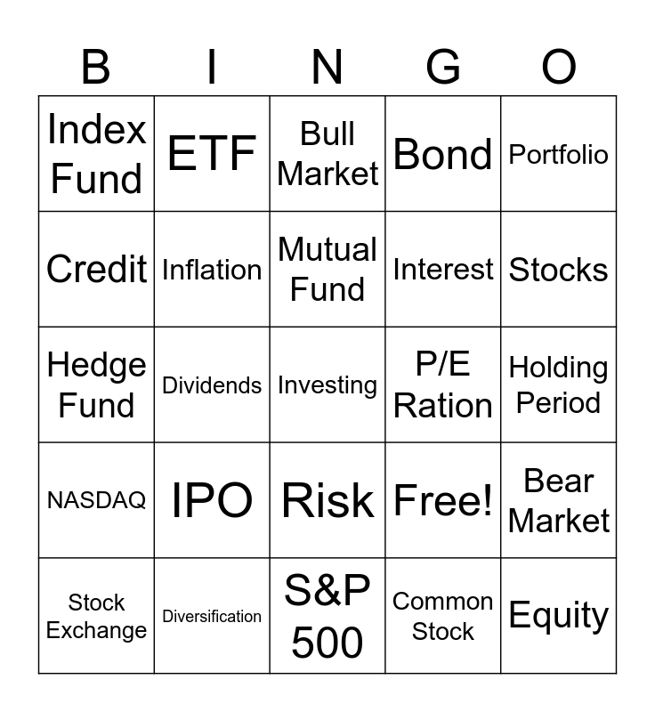 This bingo card has 25 words: IPO, S&P 500, Mutual Fund, Stock Exchange, Portfolio, Index Fund, Credit, ETF, P/E Ration, Risk, Interest, Hedge Fund, Free!, Bear Market, Inflation, Equity, Holding Period, Bull Market, Stocks, Dividends, Investing, Diversification, NASDAQ, Bond and Common Stock.