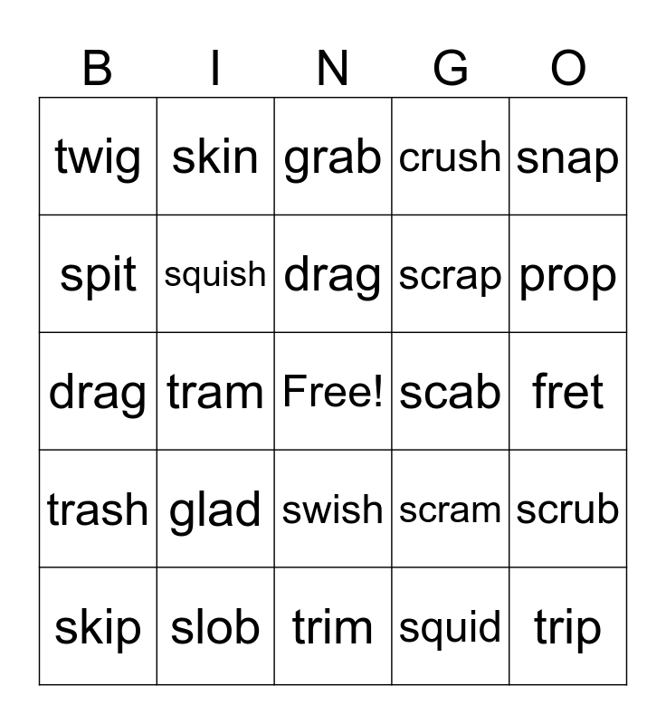 This bingo card has a free space and 24 words: glad, slob, drag, skip, snap, twig, spit, skin, scab, swish, scrap, drag, scram, scrub, squish, squid, fret, grab, prop, tram, trip, trash, crush and trim.
