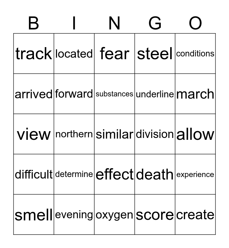 This bingo card has a free space and 24 words: determine, evening, substances, smell, conditions, track, arrived, located, division, effect, underline, view, death, experience, forward, score, allow, fear, march, northern, create, difficult, steel and oxygen.