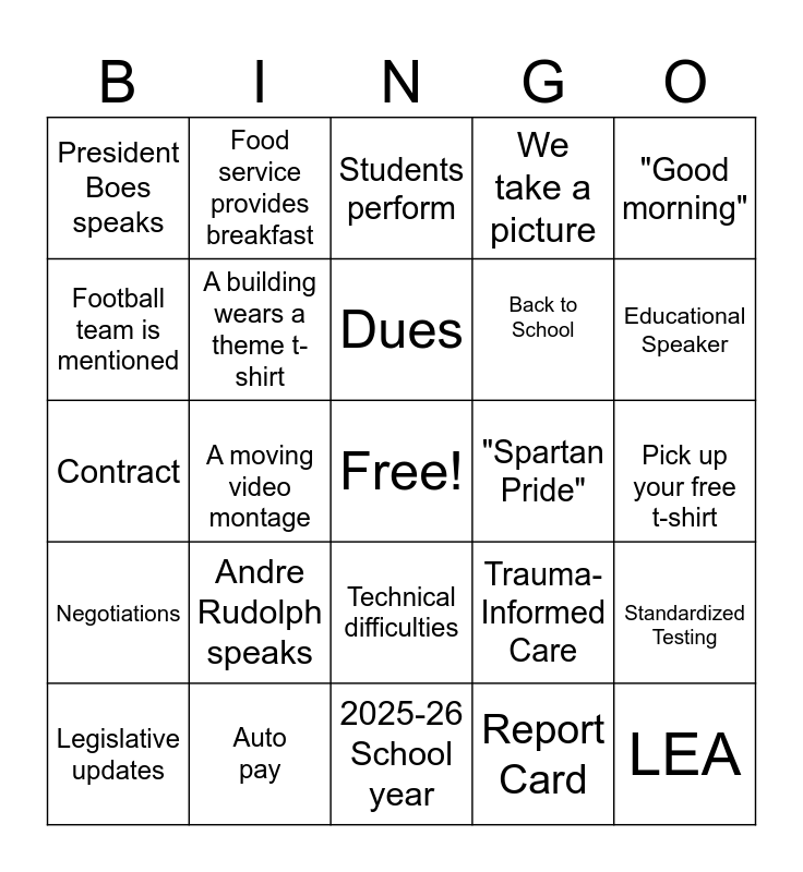 This bingo card has a free space and 24 words: Andre Rudolph speaks, Auto pay, Dues, Legislative updates, "Good morning", President Boes speaks, Football team is mentioned, Food service provides breakfast, "Spartan Pride", Technical difficulties, Back to School, Contract, Trauma-Informed Care, Standardized Testing, A building wears a theme t-shirt, Report Card, Pick up your free t-shirt, Students perform, Educational Speaker, A moving video montage, LEA, Negotiations, We take a picture and 2025-26 School year.
