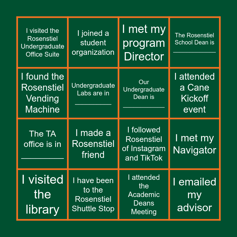 This bingo card has 16 words: I have been to the Rosenstiel Shuttle Stop, I met my Navigator, I met my program Director, I visited the Rosenstiel Undergraduate Office Suite, The TA office is in _________, I joined a student organization, I followed Rosenstiel of Instagram and TikTok, I attended the Academic Deans Meeting, I found the Rosenstiel Vending Machine, Undergraduate Labs are in __________, I visited the library, The Rosenstiel School Dean is _____________, I made a Rosenstiel friend, I attended a Cane Kickoff event, Our Undergraduate Dean is ____________ and I emailed my advisor.