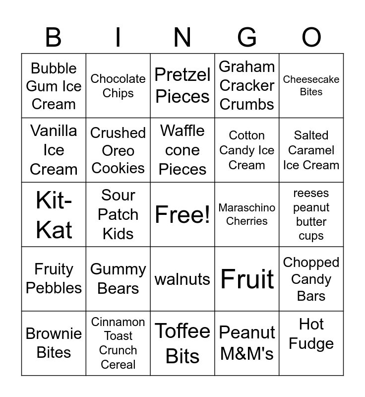 This bingo card has a free space and 53 words: Rainbow Sprinkles, Hot Fudge, Caramel Sauce, Peanut M&M's, Gummy Bears, Whipped Cream, Chocolate Chips, Chocolate Ice Cream, Vanilla Ice Cream, Cookies & Cream Ice Cream, Crushed Oreo Cookies, Mini Marshmallows, Chopped Candy Bars, Fruit, Peanuts, Brownie Bites, Waffle cone Pieces, Maraschino Cherries, Reece's Pieces, Cheesecake Bites, Sour Patch Kids, Cookie Dough Ice Cream, Cotton Candy Ice Cream, Bubble Gum Ice Cream, Mint Chocolate Chip Ice Cream, Cinnamon Toast Crunch Cereal, Captain Crunch Cereal, Shredded Coconut, Sour Gummy Worms, Salted Caramel Ice Cream, Mini Reece's Peanut Butter Cups, Jelly Beans, Yogurt Covered Raisins, Neapolitan Ice Cream, Granola, Lucky Charms Cereal, Graham Cracker Crumbs, Toffee Bits, Pretzel Pieces, snickers, twix, milky way, reeses peanut butter cups, M&M's, Magic Shell, walnuts, pecans, Butterfinger, Kit-Kat, Fruity Pebbles, Bacon bits, Marshmallow Fluff and Potato chips.