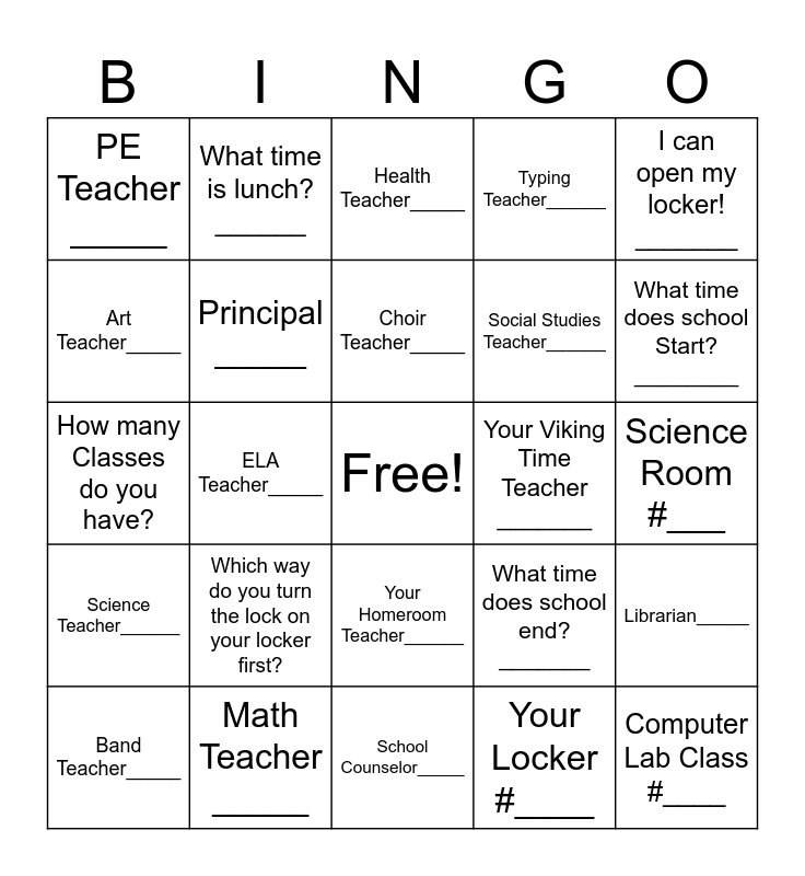 This bingo card has a free space and 30 words: Math Teacher _____, ELA Teacher ______, ELA Teacher_____, Math Teacher ______, PE Teacher _____, Health Teacher_____, Principal _____, Your Homeroom Teacher______, Your Viking Time Teacher _______, School Counselor_____, Science Room #___, Computer Lab Class #____, Your Locker #____, Who Works in the office?, What time does school Start? ________, Who is in classroom #103? _______, What time does school end? _______, Science Teacher______, Which way do you turn the lock on your locker first?, I can open my locker! _______, How many Classes do you have?, First day of school? _______, What time is lunch?______, Social Studies Teacher______, Art Teacher_____, Typing Teacher______, Librarian_____, Band Teacher_____, Choir Teacher_____ and How long in between Classes? ______.
