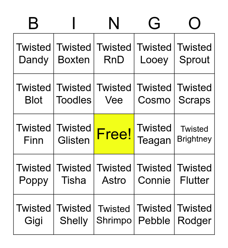 This bingo card has a free space and 26 words: Twisted Astro, Twisted Pebble, Twisted Vee, Twisted Shelly, Twisted Sprout, Twisted Dandy, Twisted Blot, Twisted Boxten, Twisted Brightney, Twisted Connie, Twisted Cosmo, Twisted Finn, Twisted Flutter, Twisted Gigi, Twisted Glisten, Twisted Goob, Twisted Looey, Twisted Poppy, Twisted RnD, Twisted Rodger, Twisted Scraps, Twisted Shrimpo, Twisted Teagan, Twisted Tisha, Twisted Toodles and Twisted Yatta.