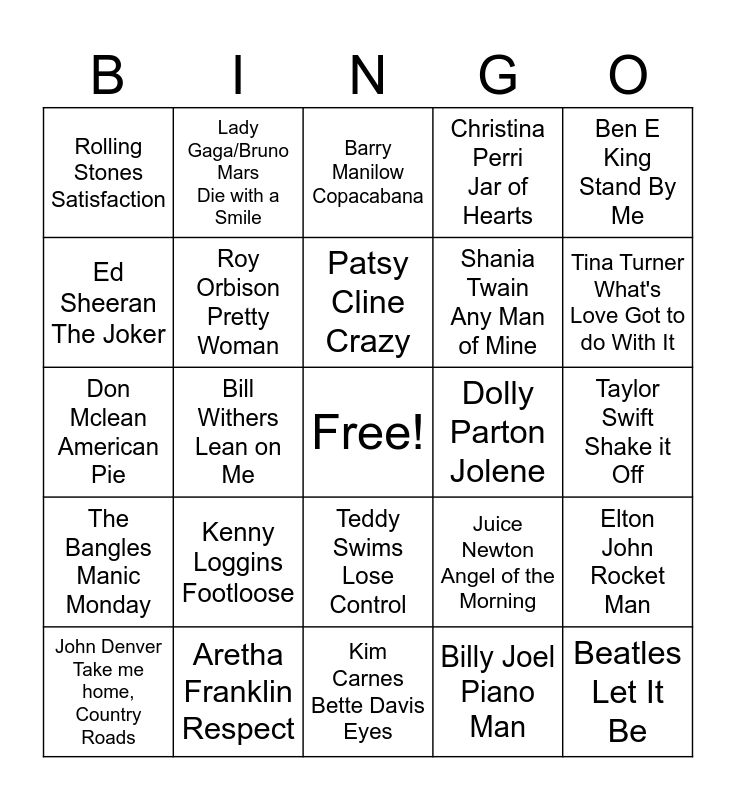 This bingo card has a free space and 29 words: Elvis Don't be Cruel, Aretha Franklin Respect, Barry Manilow Copacabana, Neil Diamond Sweet Caroline, Ben E King Stand By Me, Rolling Stones Satisfaction, Roy Orbison Pretty Woman, Patsy Cline Crazy, Dolly Parton Jolene, Elton John Rocket Man, John Denver Take me home, Country Roads, Bill Withers Lean on Me, Billy Joel Piano Man, Beatles Let It Be, Don Mclean American Pie, Bonnie Tyler Total Eclipse of the Sun, Kim Carnes Bette Davis Eyes, Juice Newton Angel of the Morning, Tina Turner What's Love Got to do With It, The Bangles Manic Monday, Kenny Loggins Footloose, Cyndi Lauper Girls Just Want to Have Fun, Shania Twain Any Man of Mine, Taylor Swift Shake it Off, Ed Sheeran The Joker, Lady Gaga/Bruno Mars Die with a Smile, Teddy Swims Lose Control, Christina Perri Jar of Hearts and Chappell Roan Pink Pony Club.
