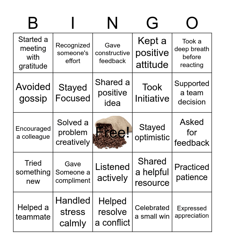 This bingo card has a free space and 24 words: Gave Someone a compliment, Handled stress calmly, Shared a positive idea, Helped a teammate, Took a deep breath before reacting, Started a meeting with gratitude, Avoided gossip, Recognized someone's effort, Stayed optimistic, Listened actively, Took Initiative, Encouraged a colleague, Shared a helpful resource, Practiced patience, Stayed Focused, Celebrated a small win, Asked for feedback, Gave constructive feedback, Supported a team decision, Solved a problem creatively, Expressed appreciation, Tried something new, Kept a positive attitude and Helped resolve a conflict.