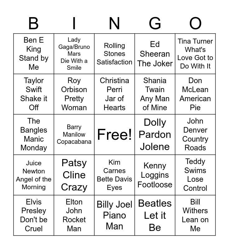 This bingo card has a free space and 29 words: Elvis Presley Don't be Cruel, Aretha Franklin Respect, Barry Manilow Copacabana, Neil Diamond Sweet Caroline, Ben E King Stand by Me, Rolling Stones Satisfaction, Roy Orbison Pretty Woman, Patsy Cline Crazy, Dolly Pardon Jolene, Elton John Rocket Man, John Denver Country Roads, Bill Withers Lean on Me, Billy Joel Piano Man, Beatles Let it Be, Don McLean American Pie, Bonnie Tyler Total Eclipse of the Heart, Kim Carnes Bette Davis Eyes, Juice Newton Angel of the Morning, Tina Turner What's Love Got to Do With It, The Bangles Manic Monday, Kenny Loggins Footloose, Cyndi Lauper Girls Just Want to Have Fun, Shania Twain Any Man of Mine, Taylor Swift Shake it Off, Ed Sheeran The Joker, Lady Gaga/Bruno Mars Die With a Smile, Teddy Swims Lose Control, Christina Perri Jar of Hearts and Chappell Roan Pink Pony Club.