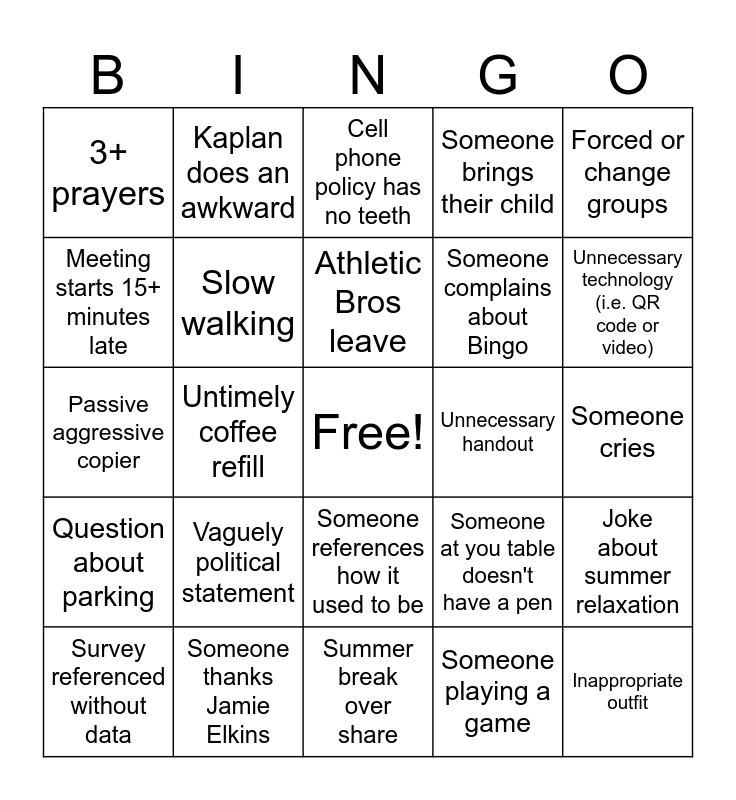 This bingo card has a free space and 34 words: Someone asleep, Someone playing a game, Someone planning, Someone with 3+ drinks, Question about parking, Slow walking, Forced or change groups, Survey referenced without data, Kaplan does an awkward, Someone asks something too real, Athletic Bros leave, Cell phone policy has no teeth, Forced silent reflection, Person not on agenda takes mic, Unnecessary handout, Unnecessary technology (i.e. QR code or video), Someone thanks Jamie Elkins, Passive aggressive copier, Vaguely political statement, Someone at you table doesn't have a pen, Someone references how it used to be, HR says you're welcome, 3+ prayers, Someone cries, Summer break over share, Inappropriate outfit, Someone brings their child, Construction Complaint, Someone complains about Bingo, Meeting starts 15+ minutes late, Part of meeting becomes an email, Untimely coffee refill, Joke about summer relaxation and A new hire is not present for introductions.
