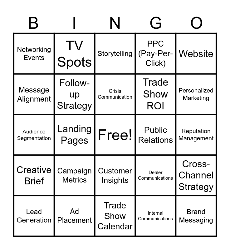 This bingo card has a free space and 55 words: Booth Design, Lead Generation, Product Demos, Networking Events, Trade Show Calendar, Event Sponsorship, Follow-up Strategy, On-site Promotions, Trade Show ROI, SEO (Search Engine Optimization), PPC (Pay-Per-Click), Social Media Strategy, Email Campaigns, Content Marketing, Analytics Dashboard, Influencer Partnerships, Website, Landing Pages, Conversion Rate Optimization, Brand Messaging, Public Relations, Press Releases, Dealer Communications, Storytelling, Media Relations, Crisis Communication, Internal Communications, Brand Ambassadors, Reputation Management, Cross-Channel Strategy, Unified Messaging, Campaign Coordination, Consistent Branding, Marketing Matrix, Message Alignment, Audience Segmentation, Marketing Mix, Creative Brief, Media Buying, Kubota Brand Builder, TV Spots, Radio Ads, Banner Ads, Ad Copywriting, Campaign Metrics, Ad Placement, Brand Awareness, Customer Segmentation, CRM Software, Personalized Marketing, Feedback Surveys, Customer Journey, Retention Strategies, Customer Insights and Value Proposition.