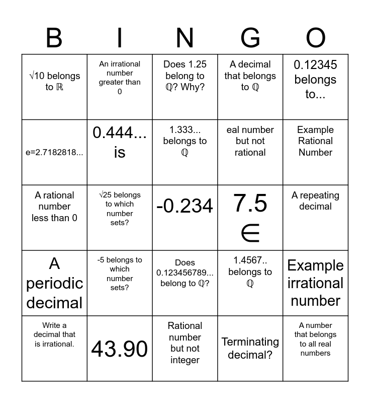 This bingo card has 36 words: Example irrational number, Is 2.727272... in ℕ, ℤ, I, ℝ or ℚ, Does not belong to ℤ, eal number but not rational, A number that belongs to all real numbers, Write a decimal that is irrational., -5 belongs to which number sets?, Rational number but not integer, A decimal that belongs to ℚ, A number that does not belong to ℕ or ℤ, A periodic decimal, √25 belongs to which number sets?, A number that is positive and irrational, A repeating decimal, A rational number less than 0, An irrational number greater than 0, -0.234, 7.5 ∈, Example Rational Number, √10 belongs to ℝ, 43.90, 1.333... belongs to ℚ, 1.4567.. belongs to ℚ, 0.99, Finite decimal, 0.444... is, Does 1.25 belong to ℚ? Why?, 5.66.. belongs to, 0.12345 belongs to..., e=2.7182818..., Does 2.875 belong to ℚ? Why?, Does 0.123456789... belong to ℚ?, Terminating decimal?, Example irrational number, Non-periodical decimal and Give an example of a decimal that does not belong to ℚ.