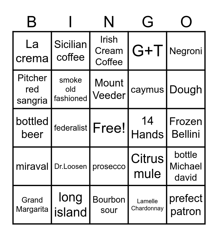This bingo card has a free space and 24 words: Grand Margarita, Dr.Loosen, Mount Veeder, Lamelle Chardonnay, Negroni, La crema, Sicilian coffee, Irish Cream Coffee, 14 Hands, Frozen Bellini, bottled beer, smoke old fashioned, Citrus mule, bottle Michael david, Pitcher red sangria, long island, Bourbon sour, G+T, Dough, miraval, federalist, prosecco, caymus and prefect patron.