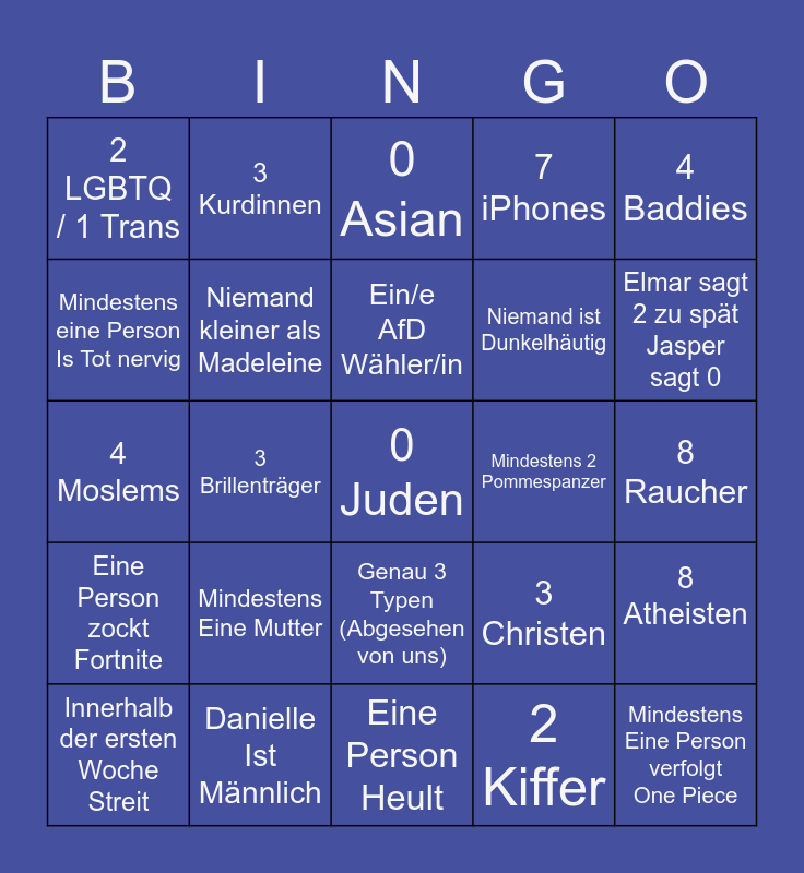 This bingo card has a free space and 24 words: Mindestens Eine Mutter, Danielle Ist Männlich, Ein/e AfD Wähler/in, Innerhalb der ersten Woche Streit, 4 Baddies, 2 LGBTQ / 1 Trans, Mindestens eine Person Is Tot nervig, 3 Kurdinnen, Mindestens 2 Pommespanzer, Genau 3 Typen (Abgesehen von uns), Niemand ist Dunkelhäutig, 4 Moslems, 3 Christen, 8 Atheisten, Niemand kleiner als Madeleine, 2 Kiffer, 8 Raucher, 0 Asian, Elmar sagt 2 zu spät Jasper sagt 0, 3 Brillenträger, Mindestens Eine Person verfolgt One Piece, Eine Person zockt Fortnite, 7 iPhones and Eine Person Heult.
