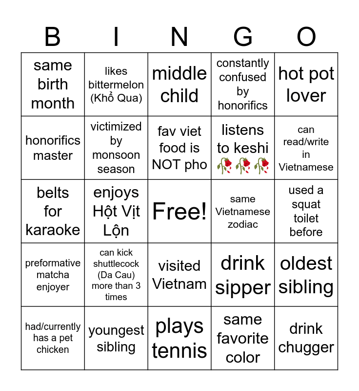This bingo card has a free space and 35 words: loves eating durian, hates the heat, enjoys the heat, victimized by monsoon season, visited Vietnam, constantly confused by honorifics, honorifics master, interested in Vietnamese culture, fav viet food is NOT pho, can count from 1-10 in viet, belts for karaoke, hot pot lover, first language is NOT English, is older than you, same birth month, same Vietnamese zodiac, same favorite color, enjoys Hột Vịt Lộn, preformative matcha enjoyer, drink chugger, drink sipper, had/currently has a pet chicken, oldest sibling, youngest sibling, middle child, can read/write in Vietnamese, knows what pandan is, Cà Phê Sữa Đá enjoyer, listens to keshi 🥀🥀🥀, used a squat toilet before, plays badminton, plays tennis, can kick shuttlecock (Da Cau) more than 3 times, likes bittermelon (Khổ Qua) and can explain Paris by Night.