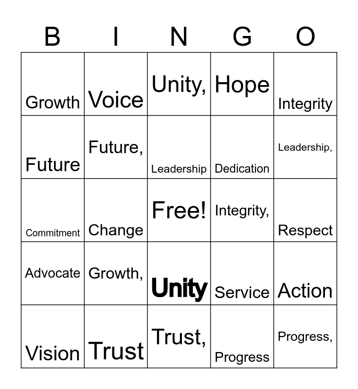 This bingo card has a free space and 26 words: Unity, Progress, Leadership, Trust, Integrity, Growth, Future, Voice, Respect, Service, Dedication, Commitment, Action, Vision, Change, Empower, Hope, Advocate, Unity,, Progress,, Leadership,, Trust,, Integrity,, Growth,, Future, and Voice, Respect, Service, Dedication, Commitment, Action, Vision, Change, Empower, Hope, Advocate, Edinburg, Local, City Hall, Palm Trees, Valley Pride, South Texas, Hidalgo, RGV, University, Culture, Home, Neighborhoods, Omar, Ochoa, Forward, Vo.
