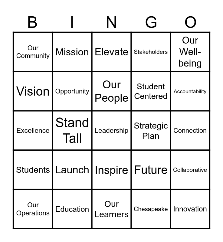 This bingo card has 25 words: Launch, Our Learners, Our People, Our Operations, Our Well-being, Our Community, Vision, Mission, Strategic Plan, Inspire, Student Centered, Excellence, Future, Collaborative, Opportunity, Innovation, Connection, Elevate, Accountability, Stand Tall, Leadership, Education, Students, Stakeholders and Chesapeake.