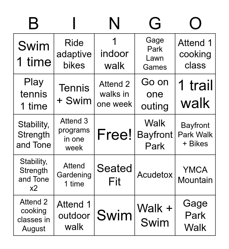 This bingo card has a free space and 24 words: Attend Gardening 1 time, Attend 1 outdoor walk, Attend 2 walks in one week, Attend 2 cooking classes in August, Attend 1 cooking class, Swim 1 time, Play tennis 1 time, Ride adaptive bikes, Walk Bayfront Park, Seated Fit, Go on one outing, Stability, Strength and Tone, Acudetox, YMCA Mountain, Tennis + Swim, Walk + Swim, Bayfront Park Walk + Bikes, 1 indoor walk, 1 trail walk, Attend 3 programs in one week, Gage Park Walk, Stability, Strength and Tone x2, Gage Park Lawn Games and Swim.