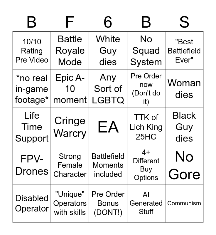 This bingo card has a free space and 24 words: Strong Female Character, "Unique" Operators with skills, Any Sort of LGBTQ, Disabled Operator, "Best Battlefield Ever", 10/10 Rating Pre Video, *no real in-game footage*, Battle Royale Mode, TTK of Lich King 25HC, Battlefield Moments included, Pre Order now (Don't do it), Life Time Support, 4+ Different Buy Options, No Gore, Epic A-10 moment, AI Generated Stuff, Black Guy dies, White Guy dies, Woman dies, Cringe Warcry, Communism, FPV-Drones, No Squad System and Pre Order Bonus (DONT!).