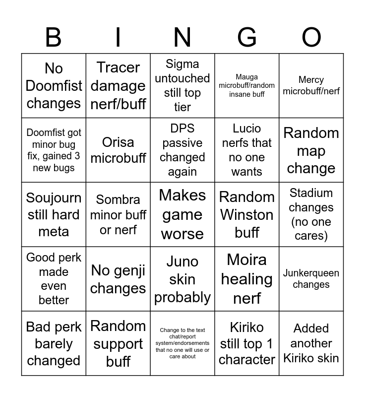 This bingo card has a free space and 24 words: No genji changes, Random support buff, DPS passive changed again, Bad perk barely changed, Mercy microbuff/nerf, No Doomfist changes, Doomfist got minor bug fix, gained 3 new bugs, Tracer damage nerf/buff, Random Winston buff, Juno skin probably, Lucio nerfs that no one wants, Soujourn still hard meta, Moira healing nerf, Junkerqueen changes, Orisa microbuff, Kiriko still top 1 character, Stadium changes (no one cares), Sigma untouched still top tier, Random map change, Sombra minor buff or nerf, Added another Kiriko skin, Good perk made even better, Mauga microbuff/random insane buff and Change to the text chat/report system/endorsements that no one will use or care about.
