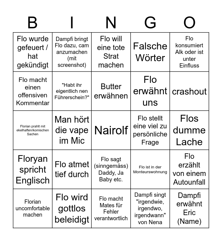 This bingo card has a free space and 24 words: Flo atmet tief durch, Flo wird gottlos beleidigt, Butter erwähnen, Florian uncomfortable machen, Flo konsumiert Alk oder ist unter Einfluss, Flo wurde gefeuert / hat gekündigt, Flo macht einen offensiven Kommentar, Dampfi bringt Flo dazu, cam anzumachen (mit screenshot), Flo stellt eine viel zu persönliche Frage, Flo sagt (sinngemäss) Daddy, Ja Baby etc., Flo erwähnt uns, Florian prahlt mit ekelhaften/komischen Sachen, Flo ist in der Monteurswohnung, Flo erzählt von einem Autounfall, "Habt ihr eigentlich nen Führerschein?", Dampfi singt "irgendwie, irgendwo, irgendwann" von Nena, Flos dumme Lache, Flo will eine tote Strat machen, crashout, Man hört die vape im Mic, Dampfi erwähnt Eric (Name), Floryan spricht Englisch, Falsche Wörter and Flo macht Mates für Fehler verantwortlich.