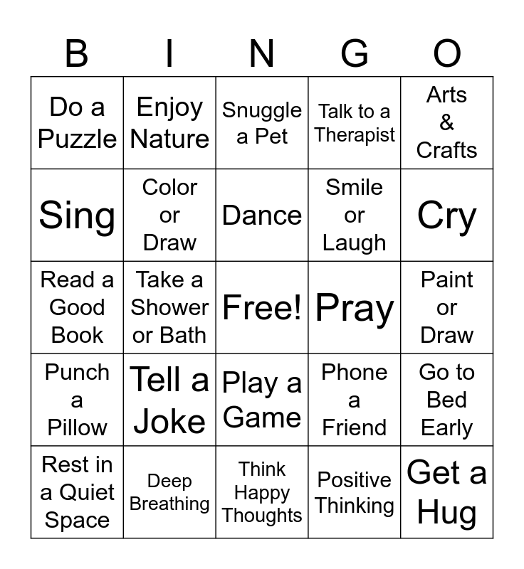 This bingo card has a free space and 24 words: Tell a Joke, Deep Breathing, Dance, Rest in a Quiet Space, Arts & Crafts, Do a Puzzle, Sing, Enjoy Nature, Pray, Play a Game, Smile or Laugh, Read a Good Book, Phone a Friend, Go to Bed Early, Color or Draw, Positive Thinking, Paint or Draw, Snuggle a Pet, Cry, Take a Shower or Bath, Get a Hug, Punch a Pillow, Talk to a Therapist and Think Happy Thoughts.
